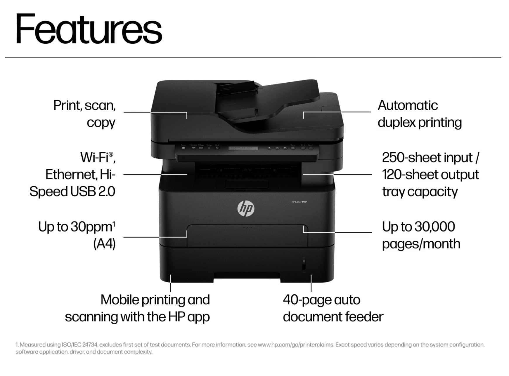 [2] First Copy Out from Ready and Simplex Copy Speed measured using ISO/IEC 29183, excludes first set of test documents. For more information see https://www.hp.com/go/printerclaims . Exact speed varies depending on the system configuration, software application and document complexity.