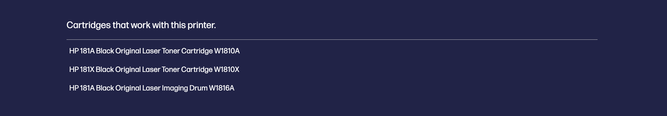 HP 181A Black Original Laser Toner Cartridge (W1810A); HP 181X Black Original Laser Toner Cartridge (W1810X); HP 181A Black Original Laser Imaging Drum (W1816A)