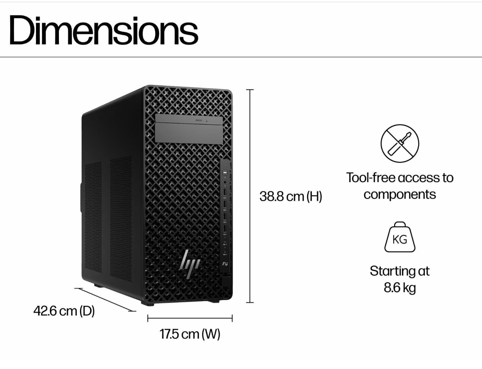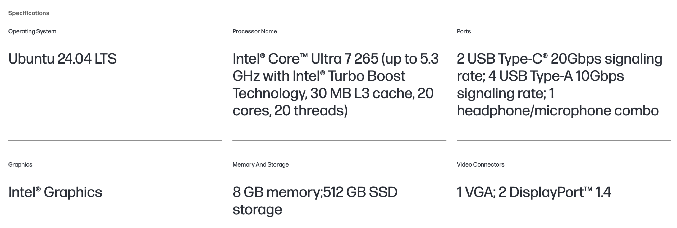 2 USB Type-A 10Gbps signaling rate; 2 DisplayPort™ 1.4; 1 RJ-45; 1 audio line-in/line-out; 3 USB Type-A 480Mbps signaling rate
